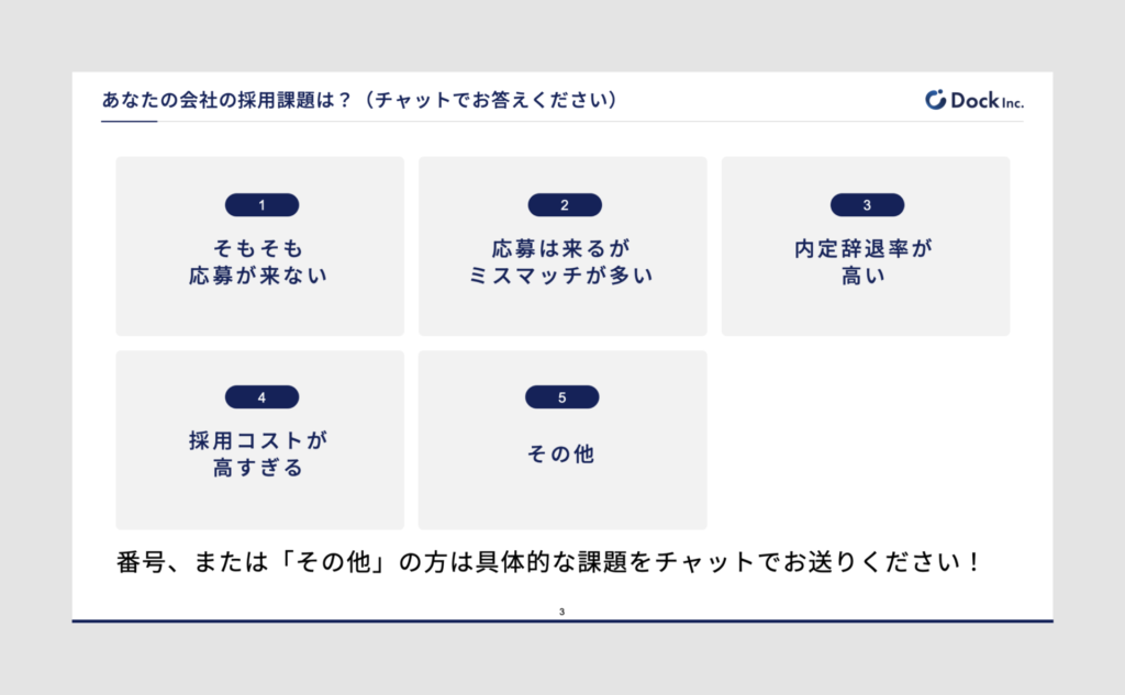 また、冒頭でチャットの使い方に慣れてもらうことで、後述の質問タイムをスムーズに進めることもできます。