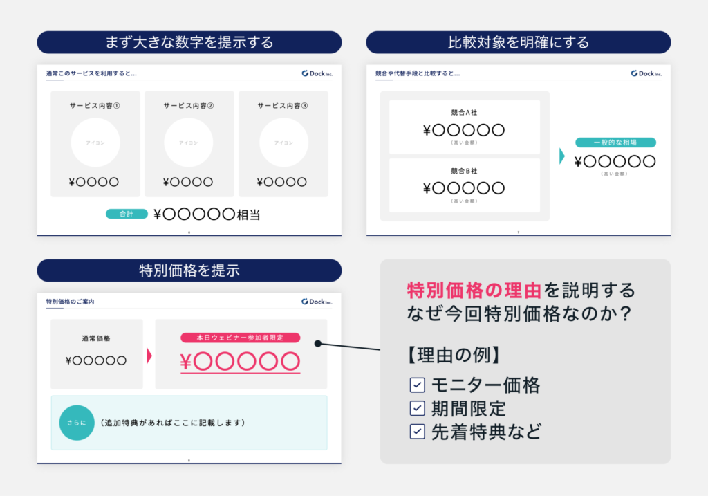 ウェビナー内で有料の商品・サービスを紹介する場合は、その価値を伝えたうえで価格を提示し、価格への納得感を醸成するのがおすすめです。