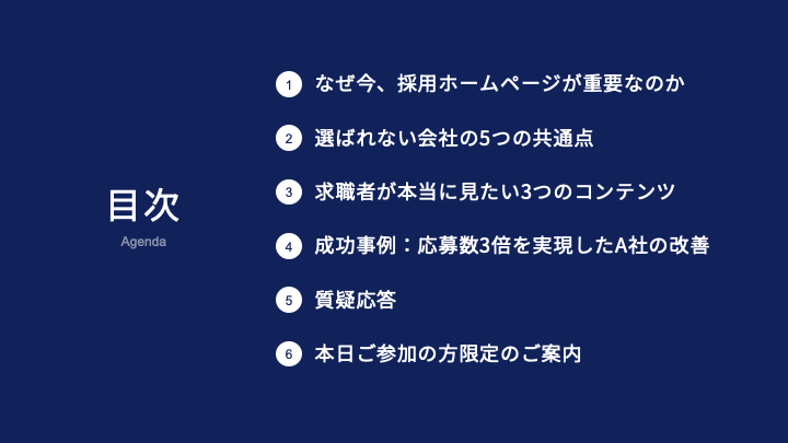 目次(アジェンダ)は、“このウェビナーでは何をどんな順番で説明されるのか”を伝えるマップです。