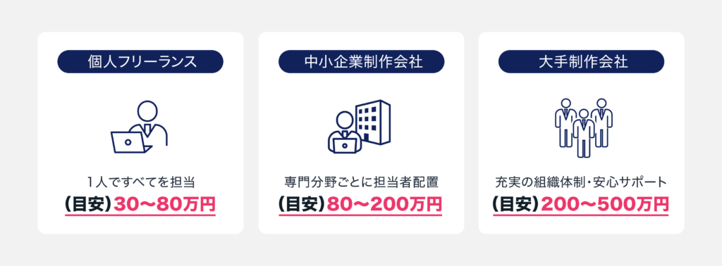 制作体制は大きく、個人フリーランス、中小企業制作会社、大手制作会社の3つに分類されます。