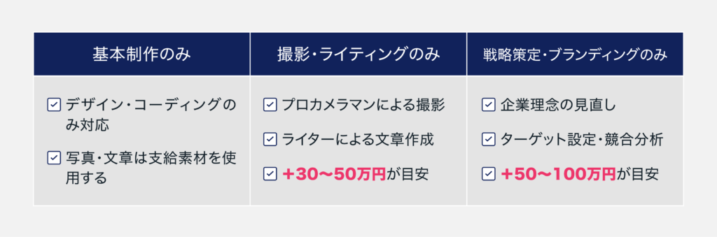 基本的なデザインとコーディングに加え、撮影・ライティングが含まれる場合はプラス30〜50万円、戦略策定・ブランディングが含まれる場合はプラス50〜100万円が目安となります。