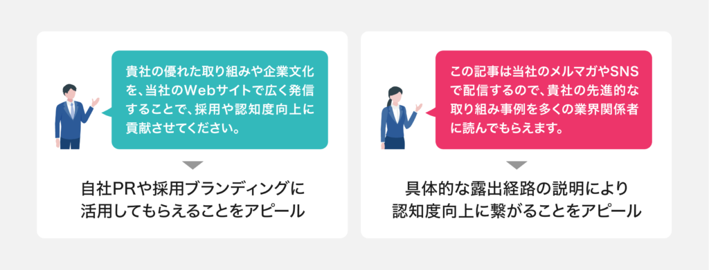 例えば「貴社の優れた取り組みや企業文化を、当社のWebサイトで広く発信することで、採用や認知度向上に貢献させてください」と伝えることで、ブランディング活動の一環としての価値を強調できます。