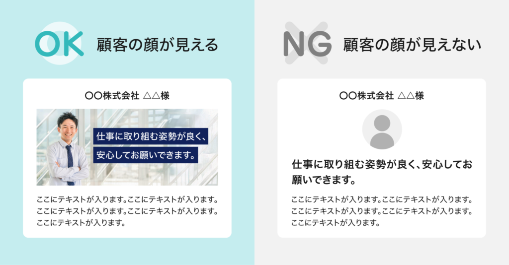 また、顧客の表情からは、企業との関係性も垣間見ることができます。写真によって、顧客との良好な関係性をアピールすることもできるでしょう。